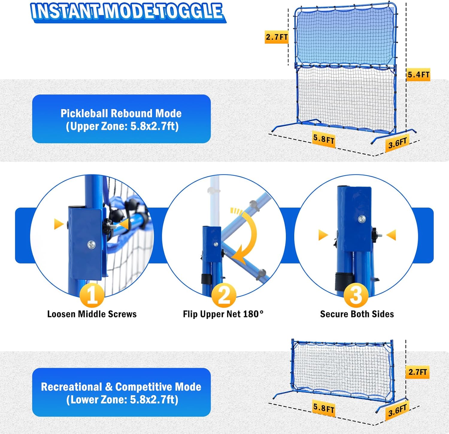 Pickleball Rebound Mode: Unfold the upper half to activate 5.8×2.7ft professional rebound zone, engineered for pickleball-specific skill drills. Perfect practice for dinks, volleys, forehands, and backhands with targeted repetition—train solo on each side or sync up with a partner on the same side to hone teamwork