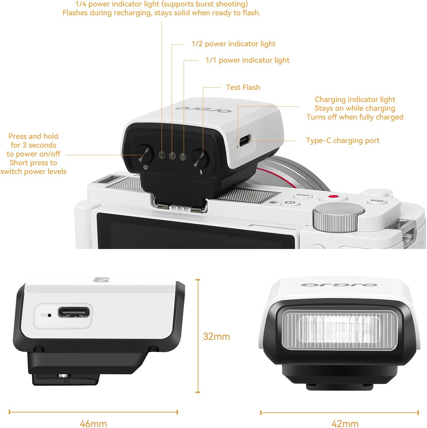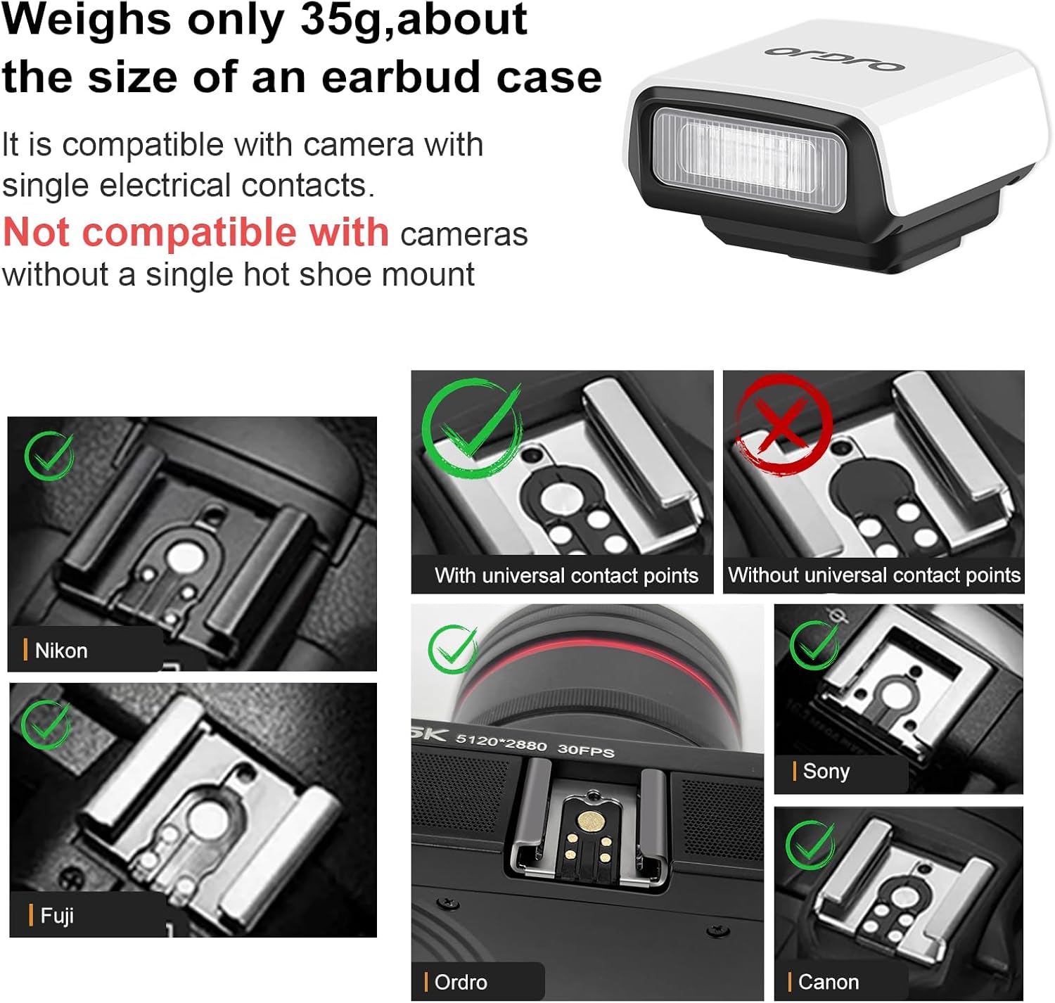 【Compact and Lightweight】The Ordro camera flash adopts a universal hot shoe mount design, compatible with small cameras or film/digital cameras. It is compact in size and has a large light-emitting area. Its dimensions are only 1.81.61.2 inches, weighing just 35g, making it easy to carry and ideal for travel use.