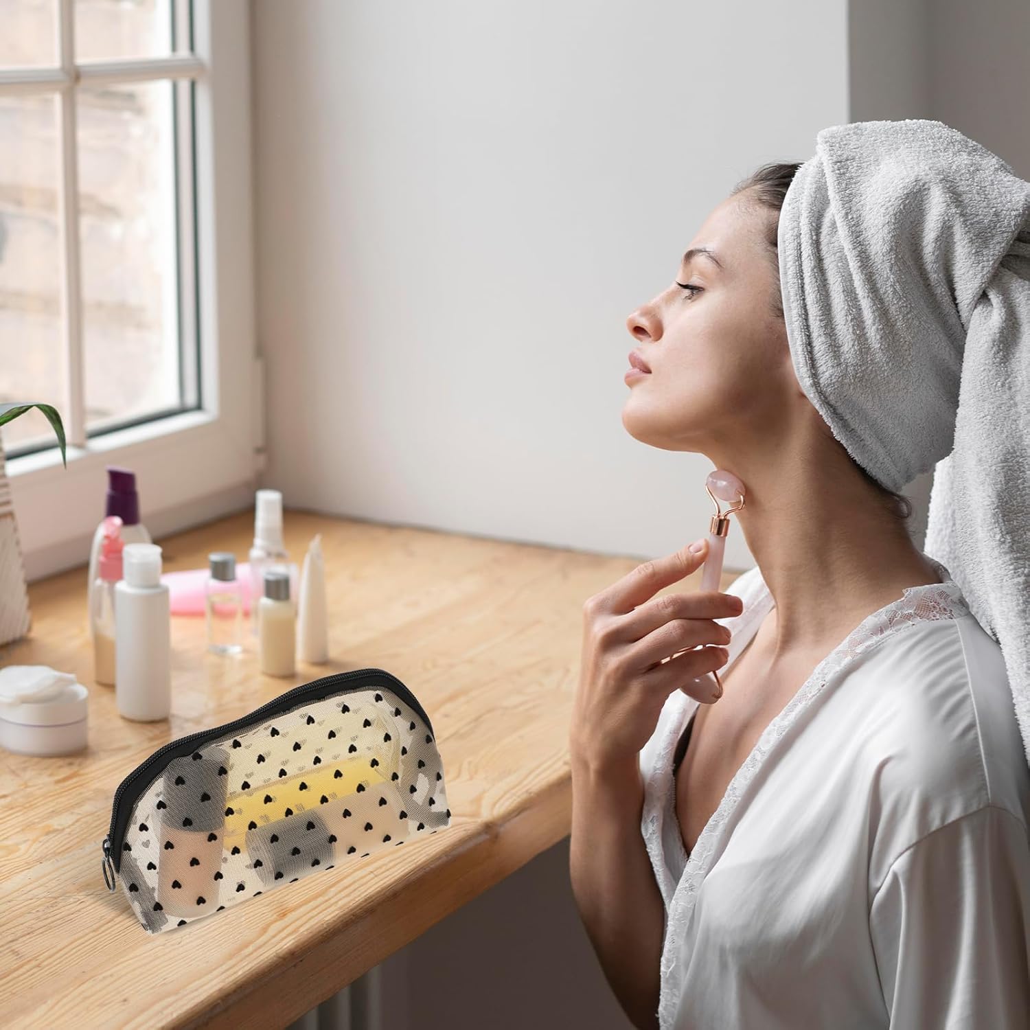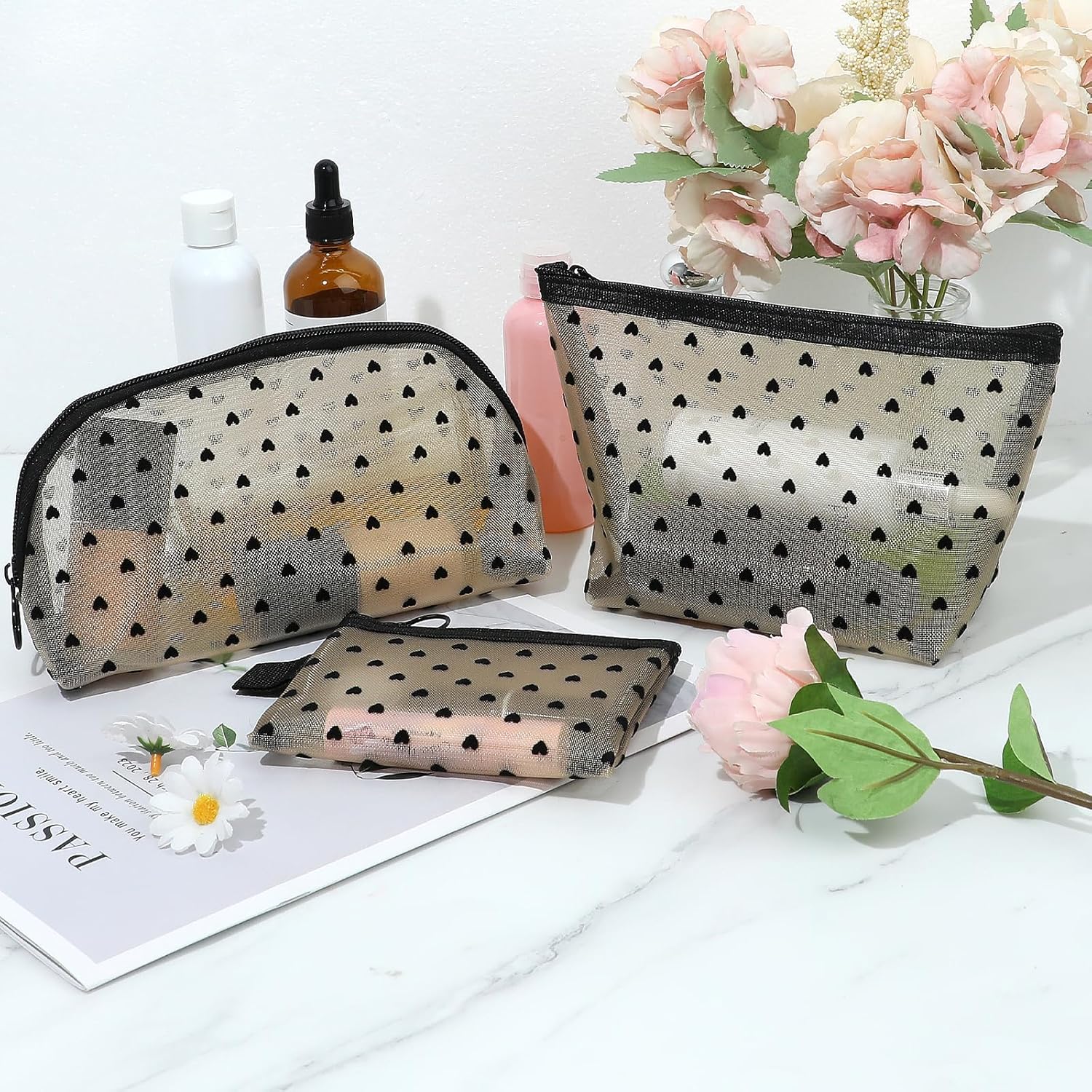 4 Pack Small Mesh Pouch Makeup Bags Zipper Mesh Heart Print Cosmetic Bags Storage Pouch for Women, Makeup Lipstick Cosmetic Accessories Organizer Bag, Small Travel Kit Storage, black