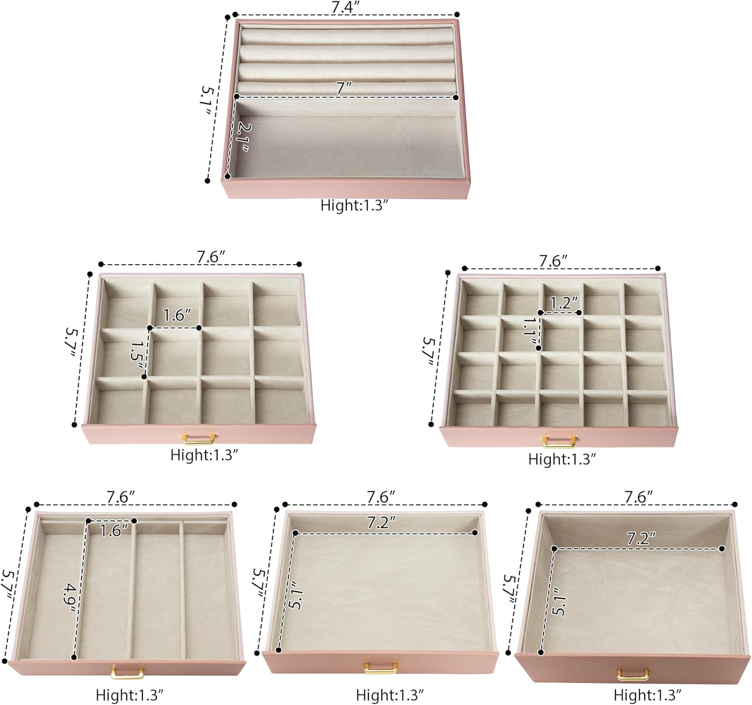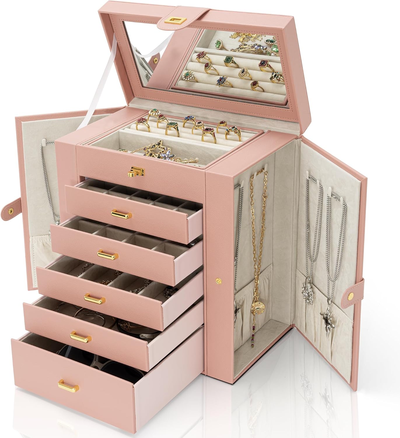 LARGE CAPACITY, With 6 versatile pull out drawers, this huge jewelry box can store a lot of jewelry accessories, such as rings, earrings, necklaces, chains, bracelets, and so on. One deeper drawer is designed for sunglasses or large jewelries