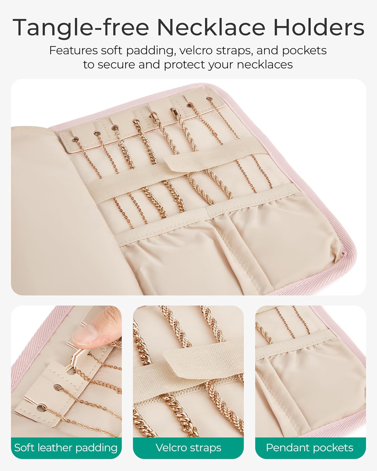 Customers find the jewelry organizer perfect for travel, appreciating that it’s small enough to fit in a large pocket book and holds many items including watches. The case is well-made, protects jewelry, and prevents necklaces from tangling. They like its color and consider it good value for money.