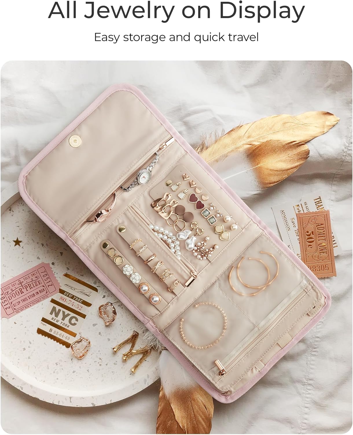 Space-Saving Design:With unfolded medium dimensions of 18.11 x 9.25 x 0.59 inches and a lightweight of just 0.44 pounds, this travel jewelry case is designed for easy portability. When closed, it compresses to the size of 6.69 x 9.25 inches, perfect for slipping into any luggage or handbag.