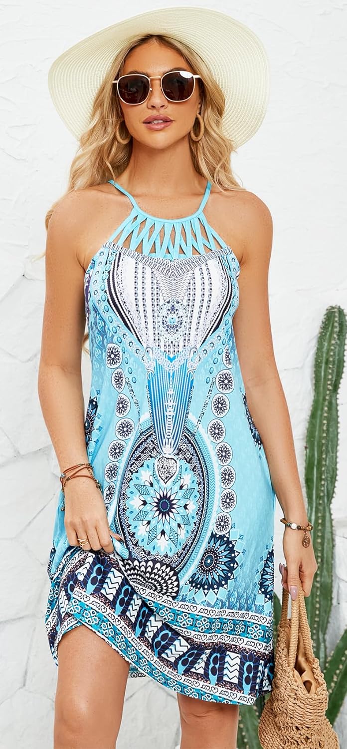 Bluetime Women’s Summer Bohemian Sleeveless Halter Neck Short Mini Dresses