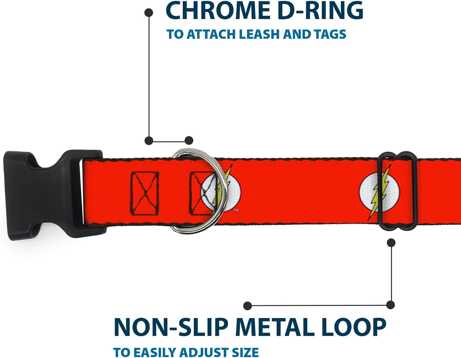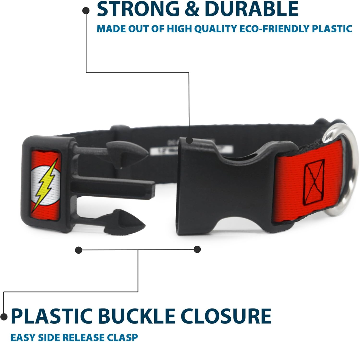 Vibrant and bold, this beautiful, polyester dog collar is made to show off your dog’s unique style through all the seasons. With an overengineered plastic buckle and strong D-ring, this durable collar can hold up to whatever your dog can dish out. This product is officially licensed by DC Comics.