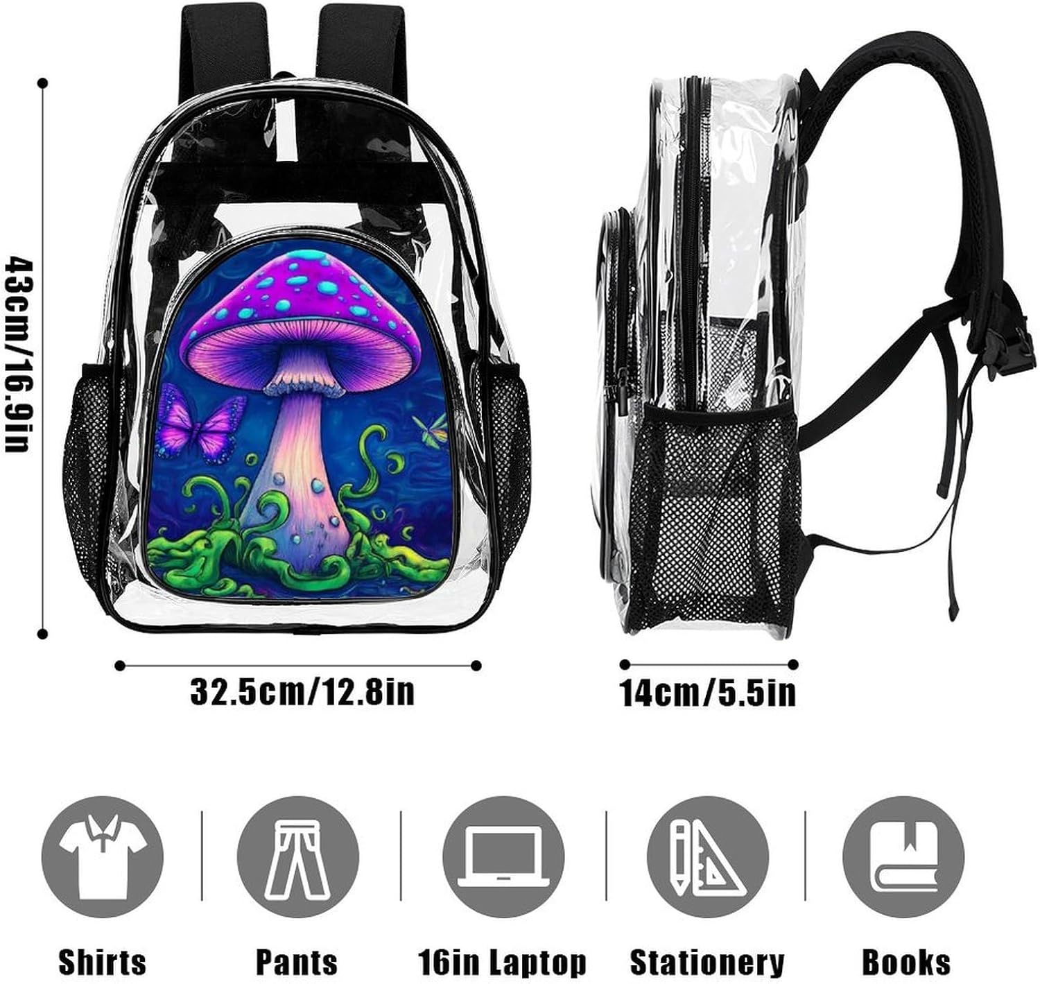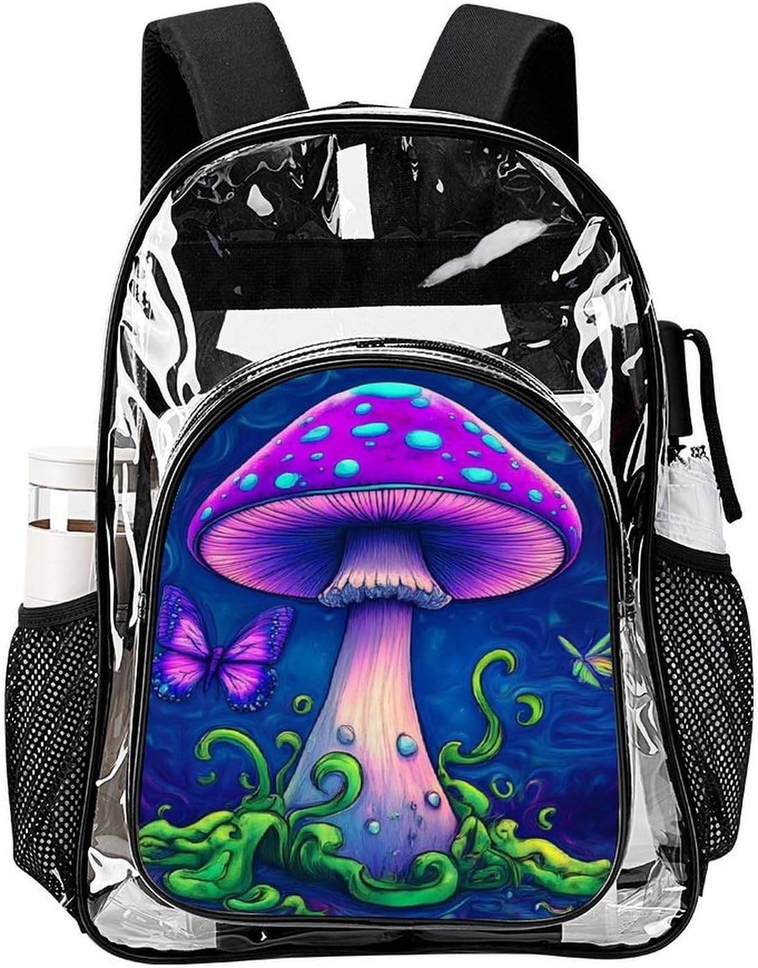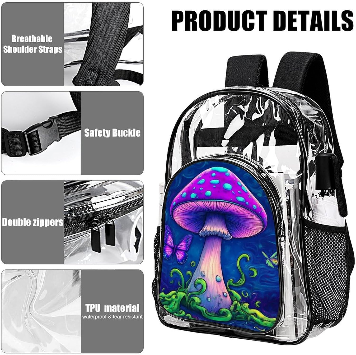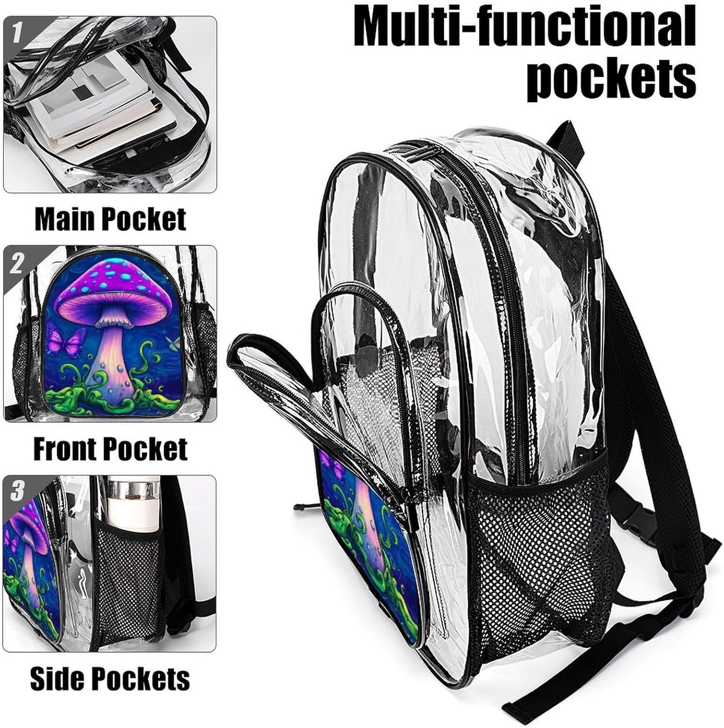 Clear Backpack Mushroom Trippy Magic Art (3) Heavy Duty Transparent Bookbag Travel Laptop Backpacks Large Bookbag Transparent Backpack