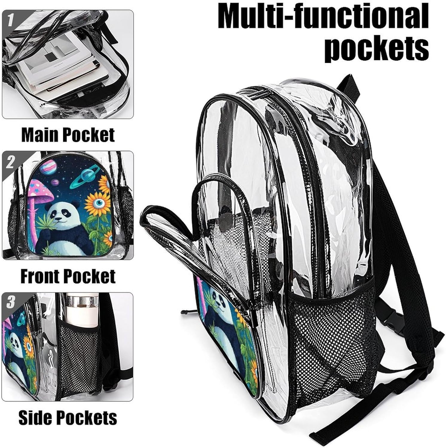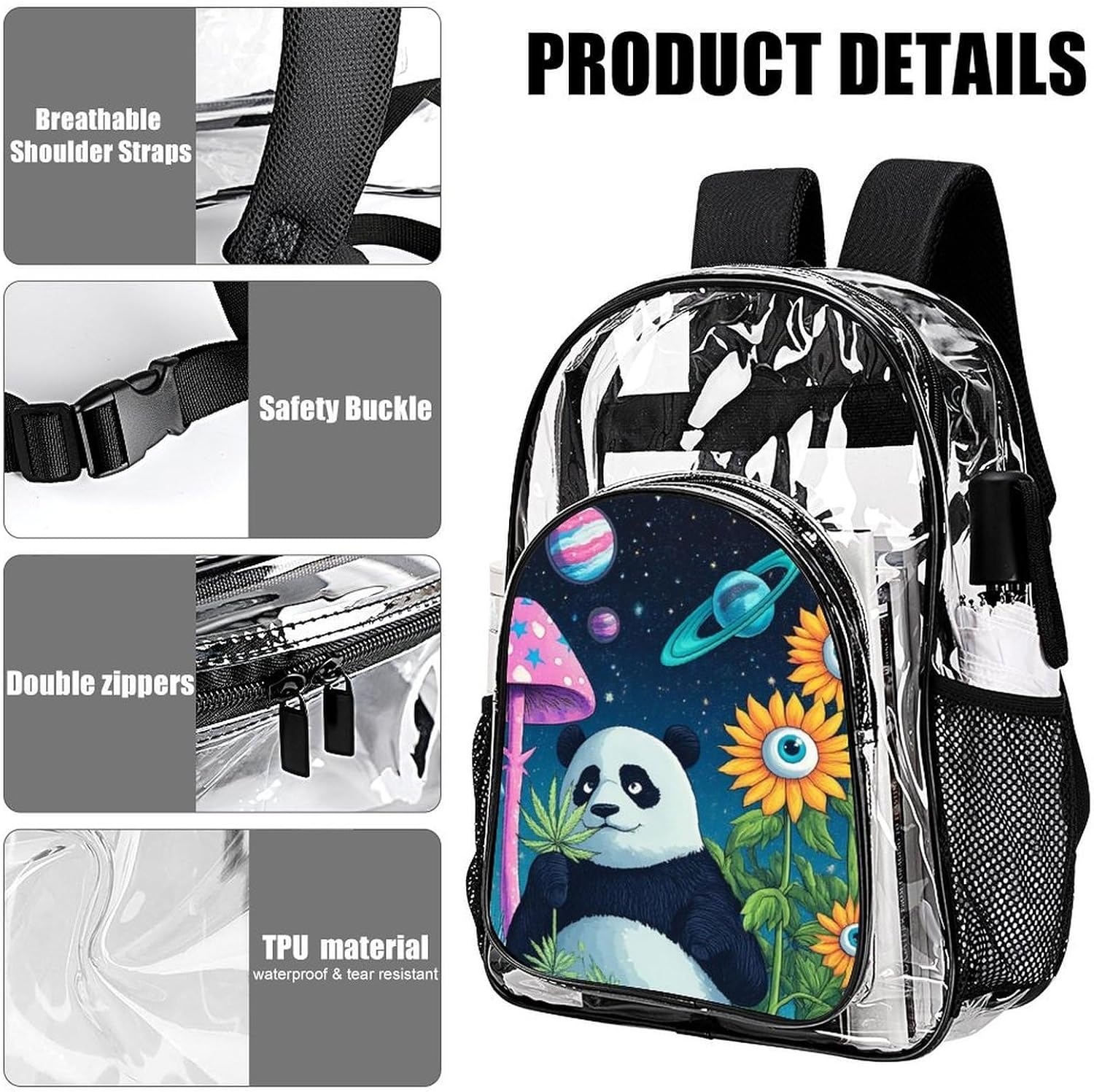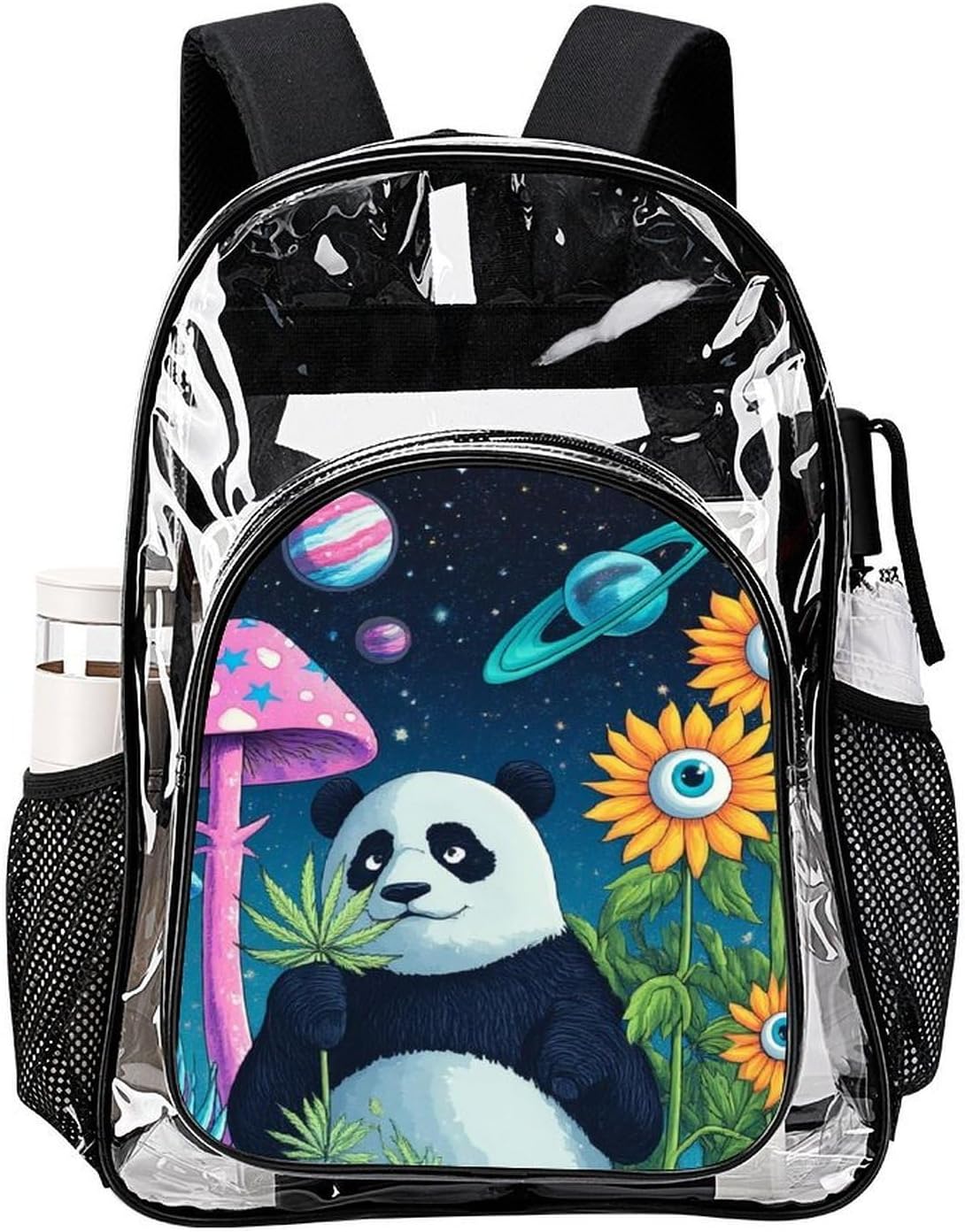 Clear Backpack Space Mushroom Planet Panda Sunflower Art (3) Heavy Duty PVC Transparent Backpack Travel Laptop Backpacks Large Bookbag See Through Bag