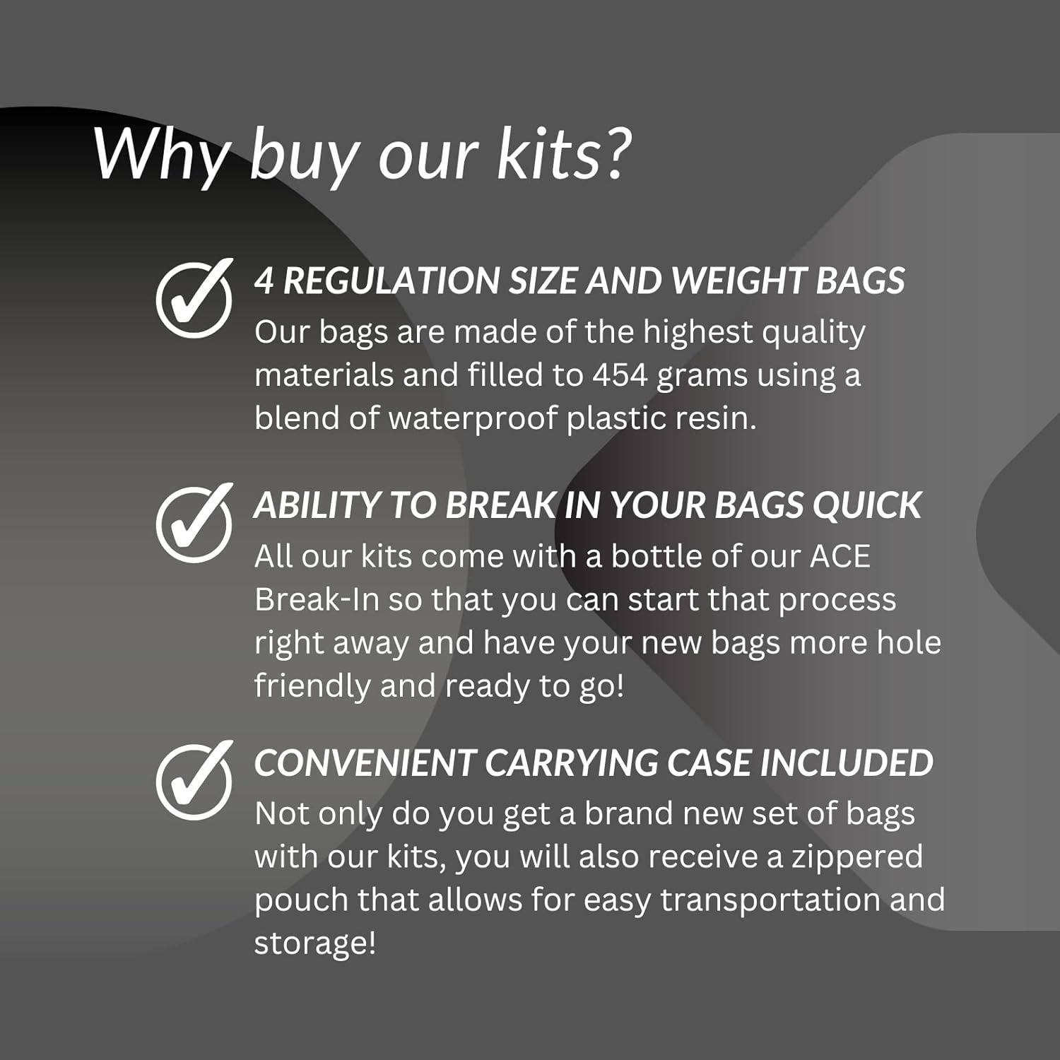 WHAT’S INCLUDED? Includes four (4) ACE Pro Stamped cornhole bags, one (1) bottle of ACE Break-In, one (1) zippered bag, and one (1) ACE Pro Bag Carry Case.