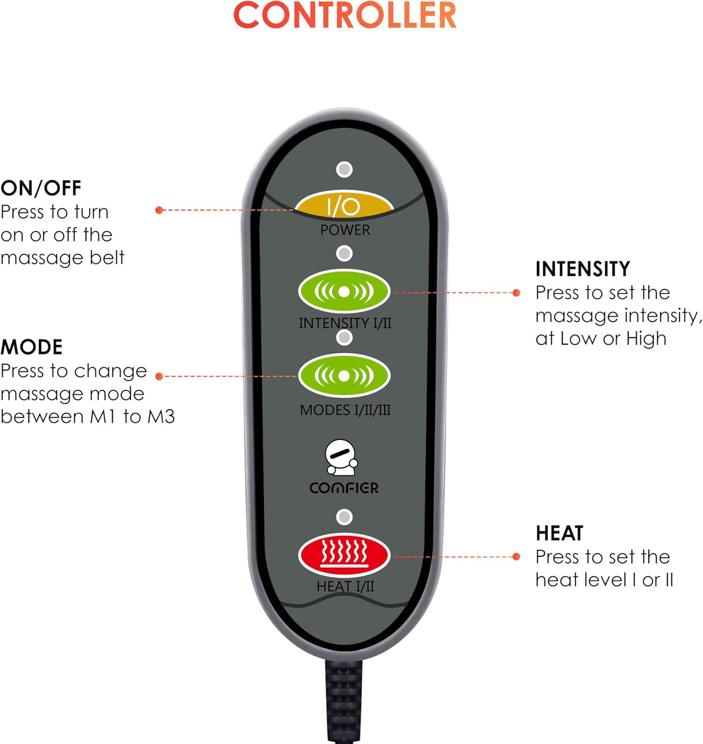 Fast Heating- Comfier back massager can quickly heat up to provide soothing heating to help relieve menstrual cramps and abdomen discomfort, lower back pain, leg arthritic, etc and improve blood circulation.
