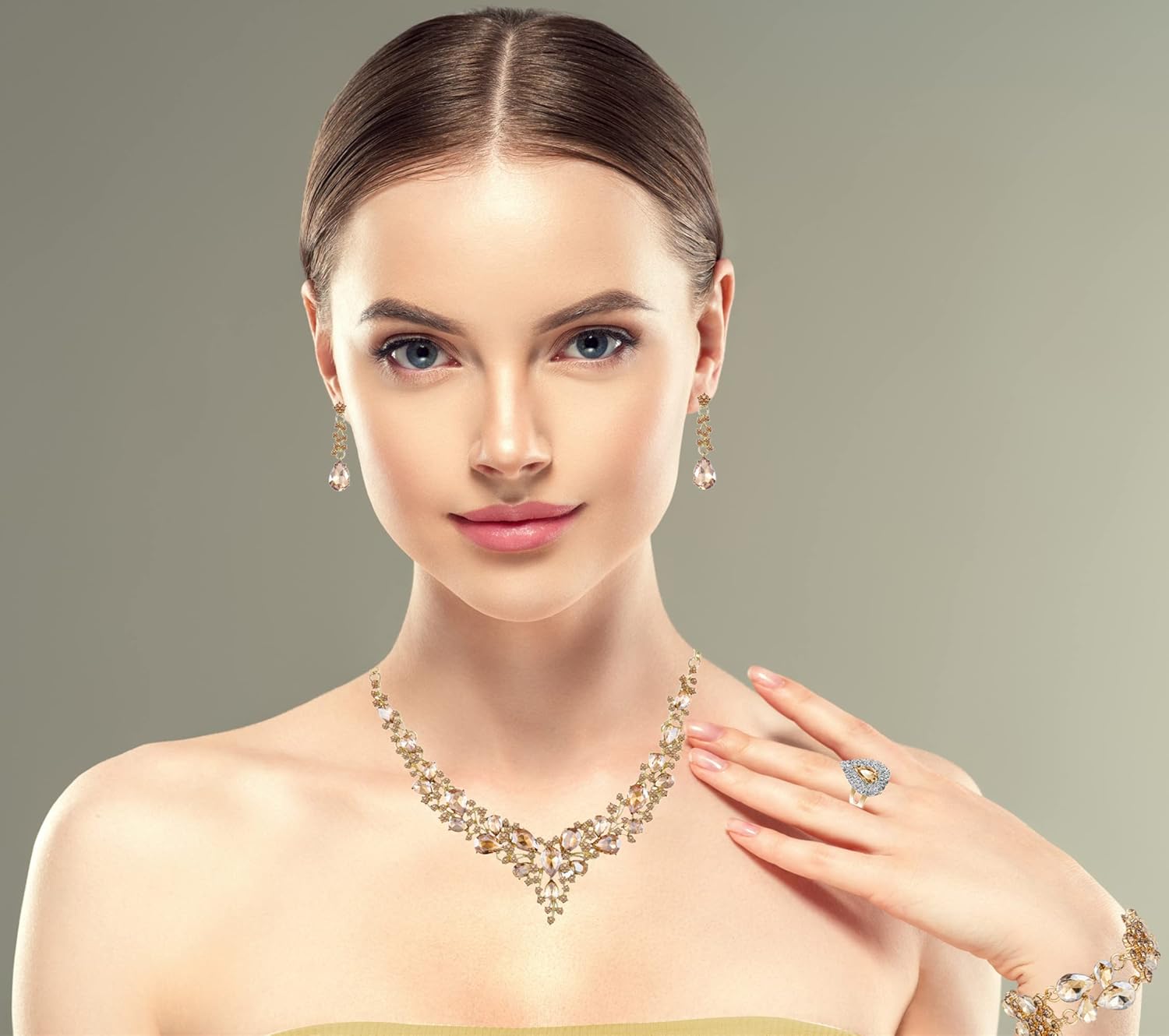 Crystal Bridal Wedding Jewelry Sets for Women Rhinestone Teardrop Crystal Statement Choker Necklace Drop Earrings Link Bracelets Rings Teardrop Jewelry Set for Brides Bridesmaids