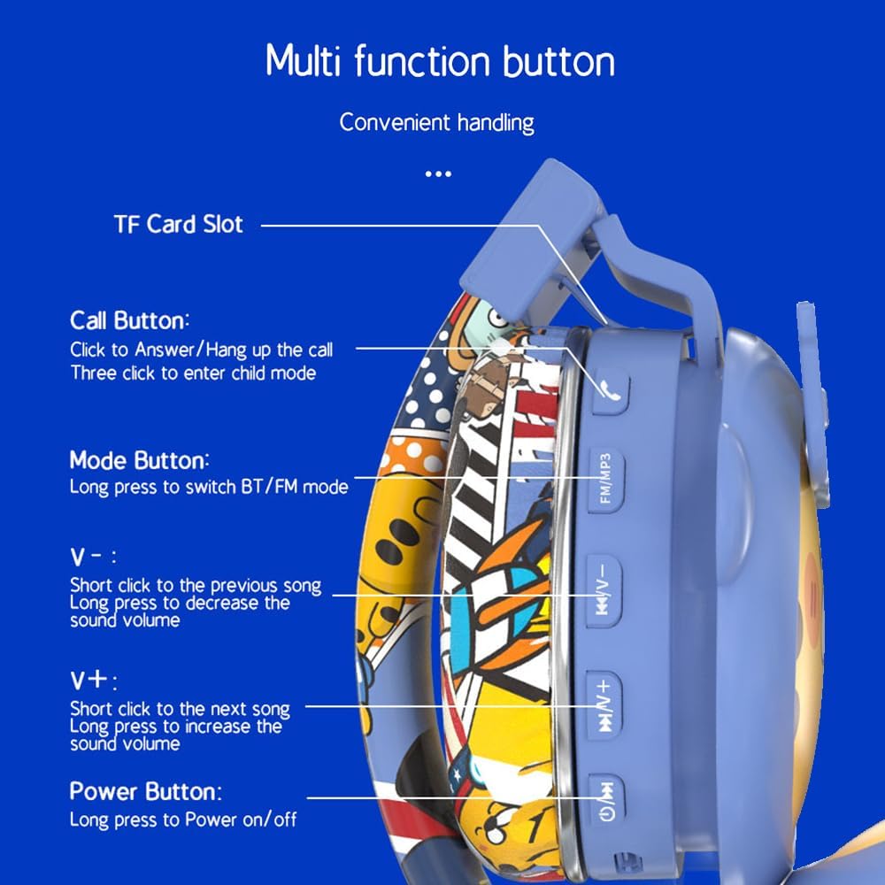 Cute Cartoon Kids Headphones – Wireless Wireless Headset, Foldable Design, Child-Friendly Hearing Protection Mode. Supports Bluetooth/TF Card/AUX Cable/FM Radio for Children & Students