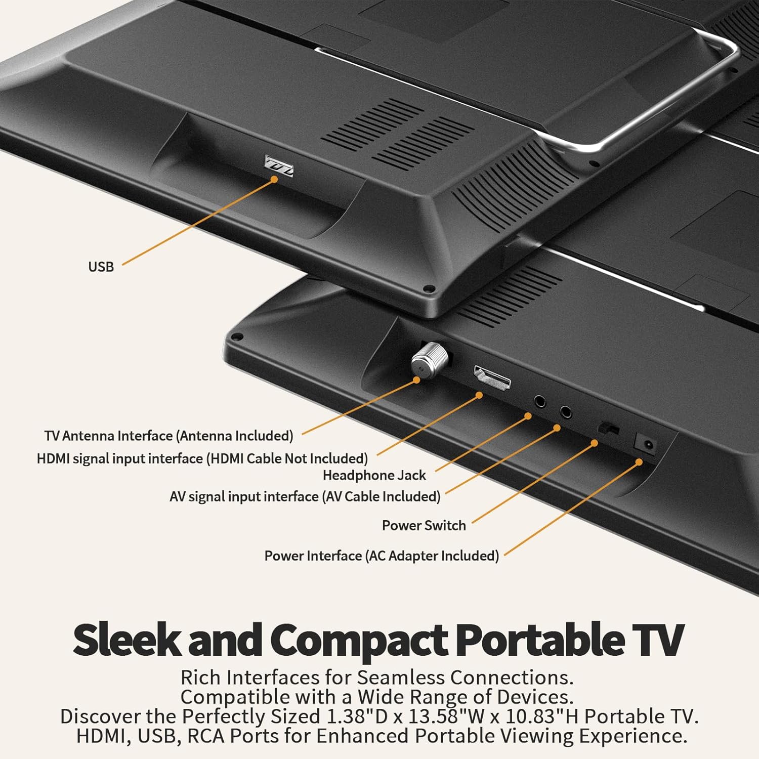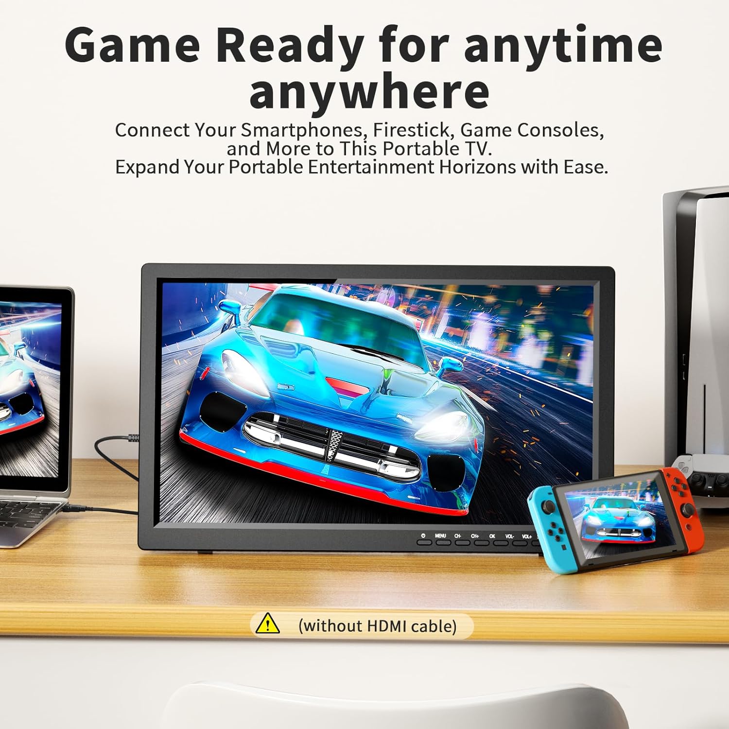Desobry 15.6″ Portable TV with ATSC Antenna & Rechargeable Battery, 1080P HD HDMI/USB/AV Inputs, Built-in Stand for Camping, Car, Emergency Use