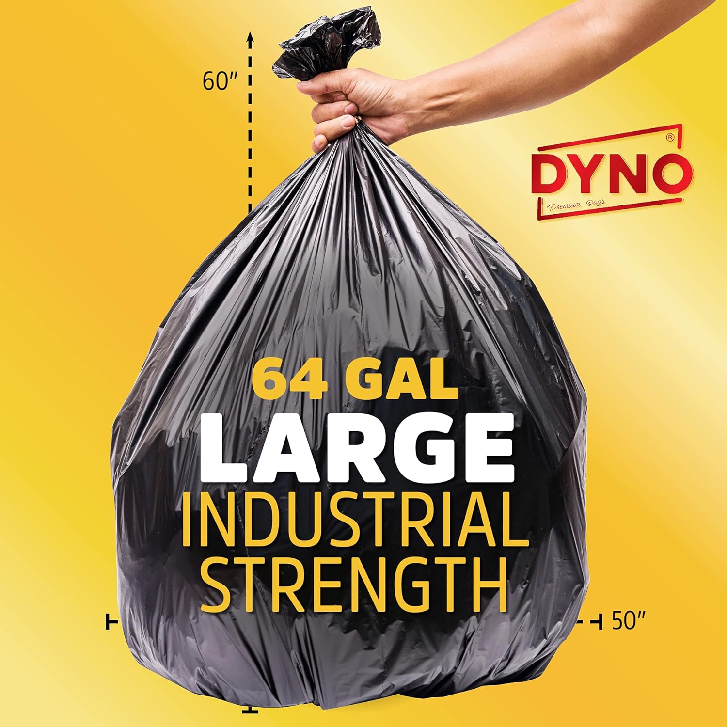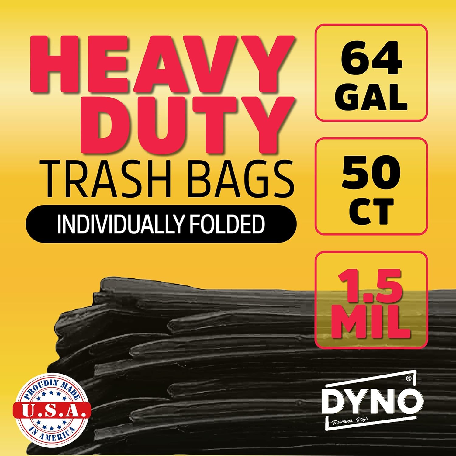 Dyno Products Online 64 Gallon Heavy Duty Trash Bags, 50 Count, 1.5 Mil Black – Individually Folded, Industrial Strength, Made in USA