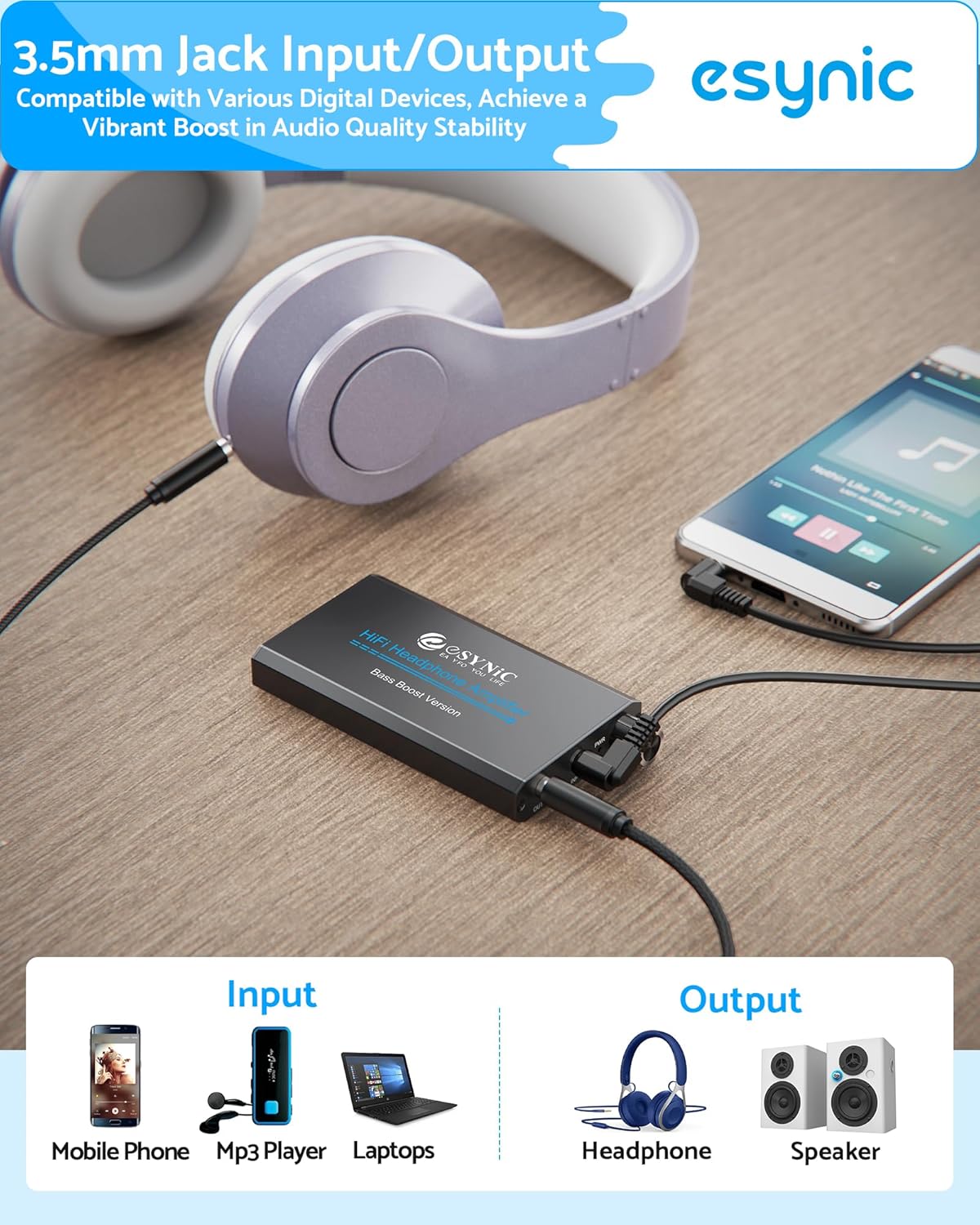 eSynic Bass Boost Headphone Amplifier – 16-300Ω Hi-Fi Audio Amp with Enhanced Bass | Rechargeable 8H Playtime | 3.5mm Portable Headphone Amp for Phone/MP3/PC | Aluminum Alloy | SNR>100dB 0.005% THD