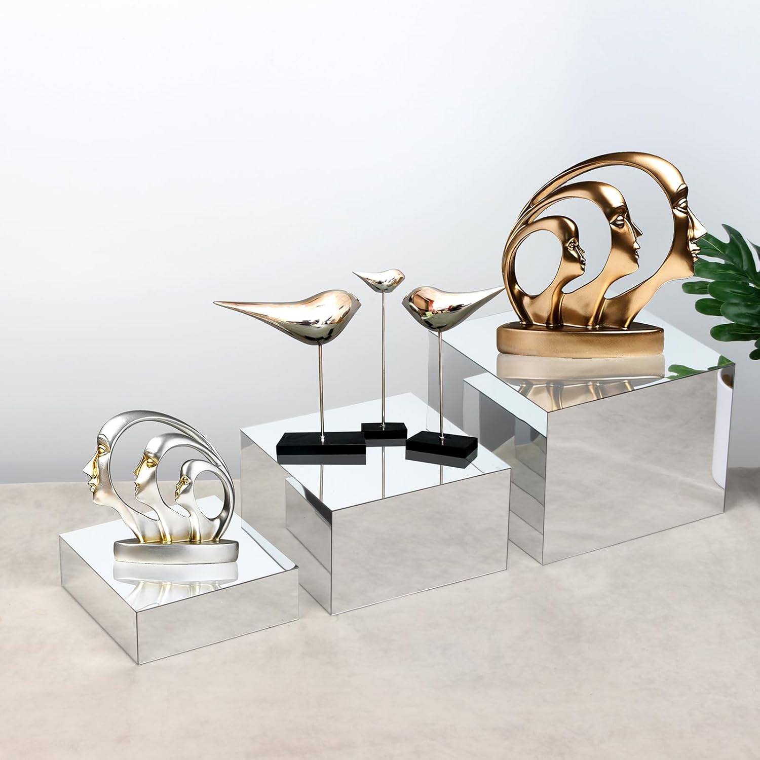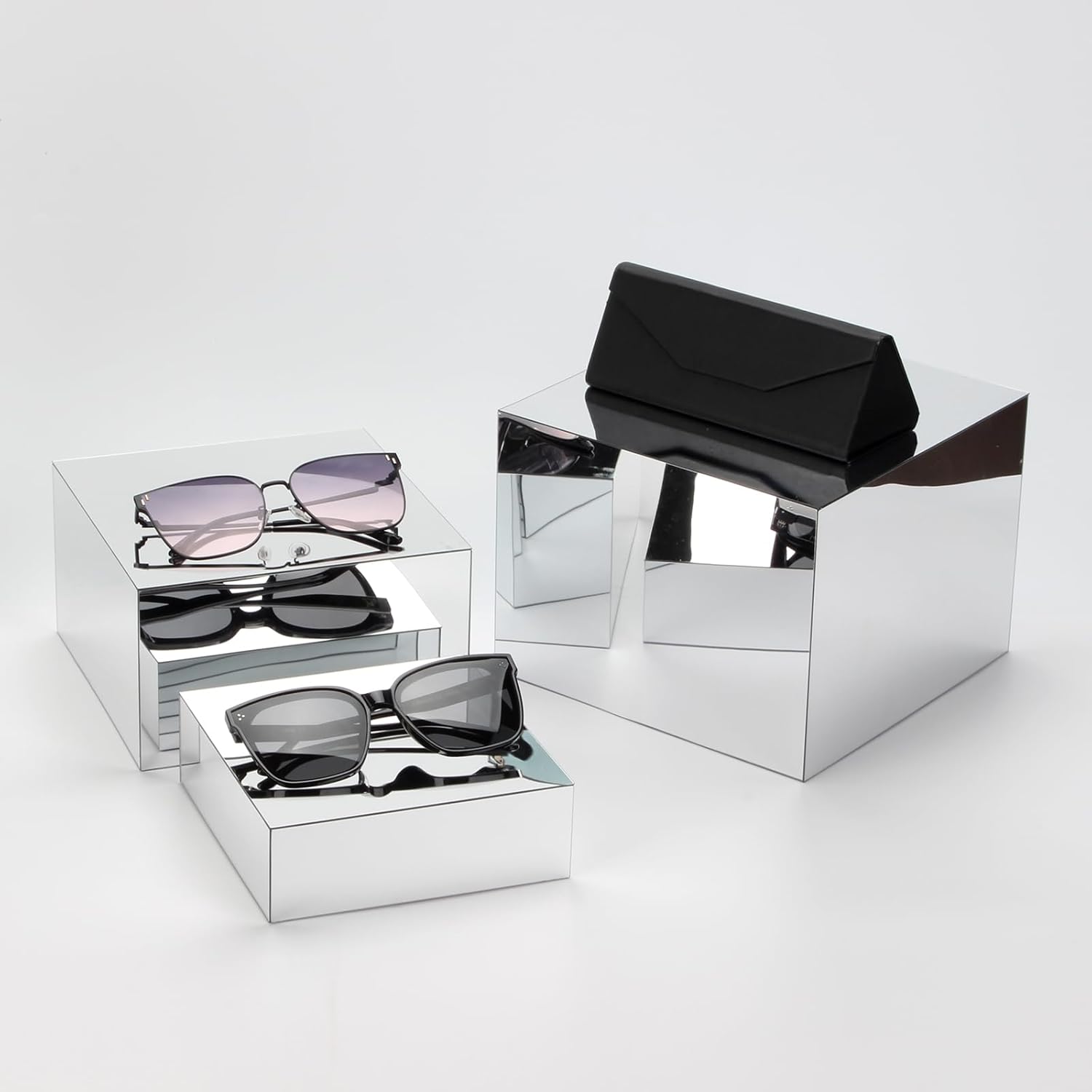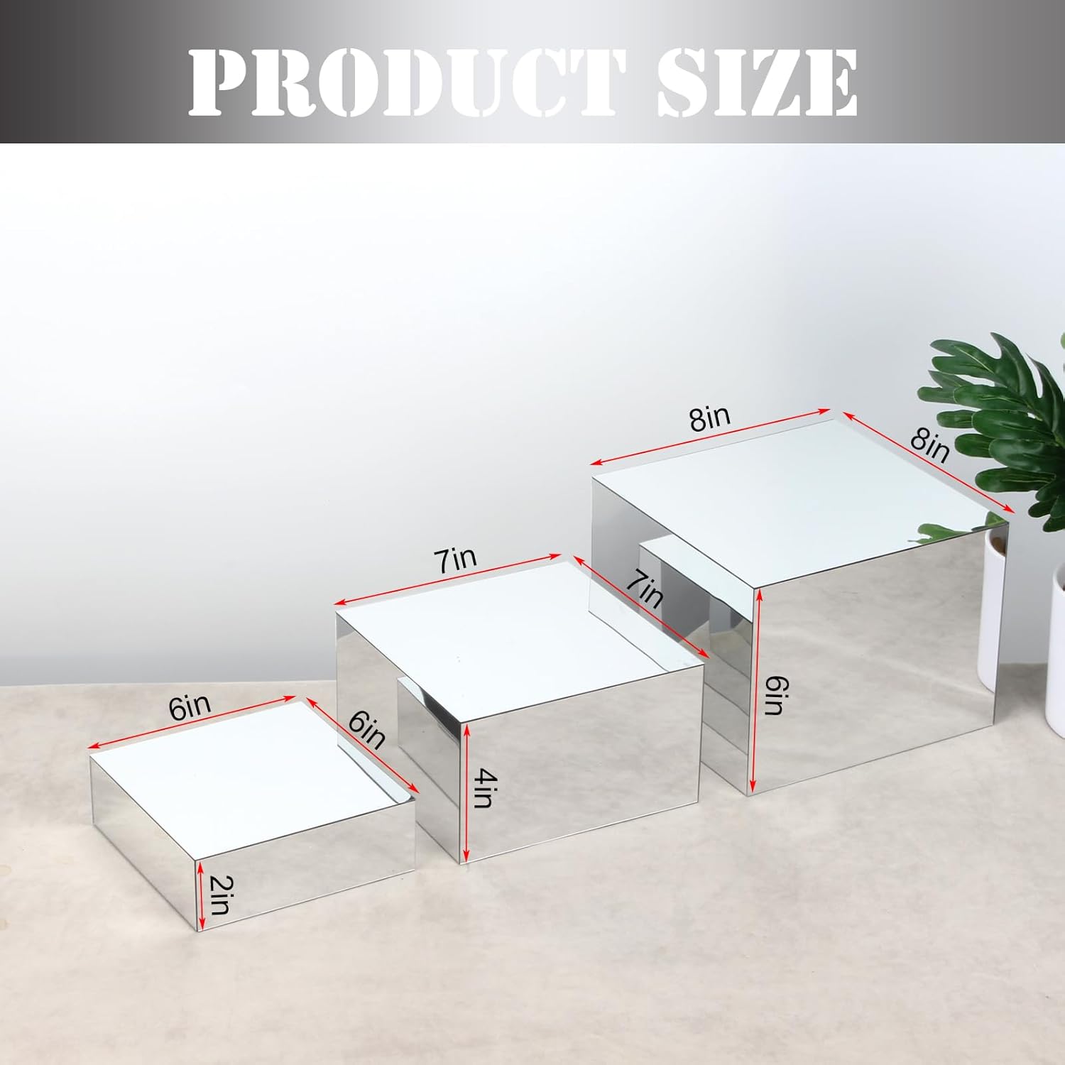 Glossy Silver Acrylic Boxes Dessert Collection Jewelry Perfume Display Stand Shelf, Hollow Bottom Cube Organizer Countertop Nesting Risers for Hangbag Shoe Home Boutique Retail Store, 3Pcs