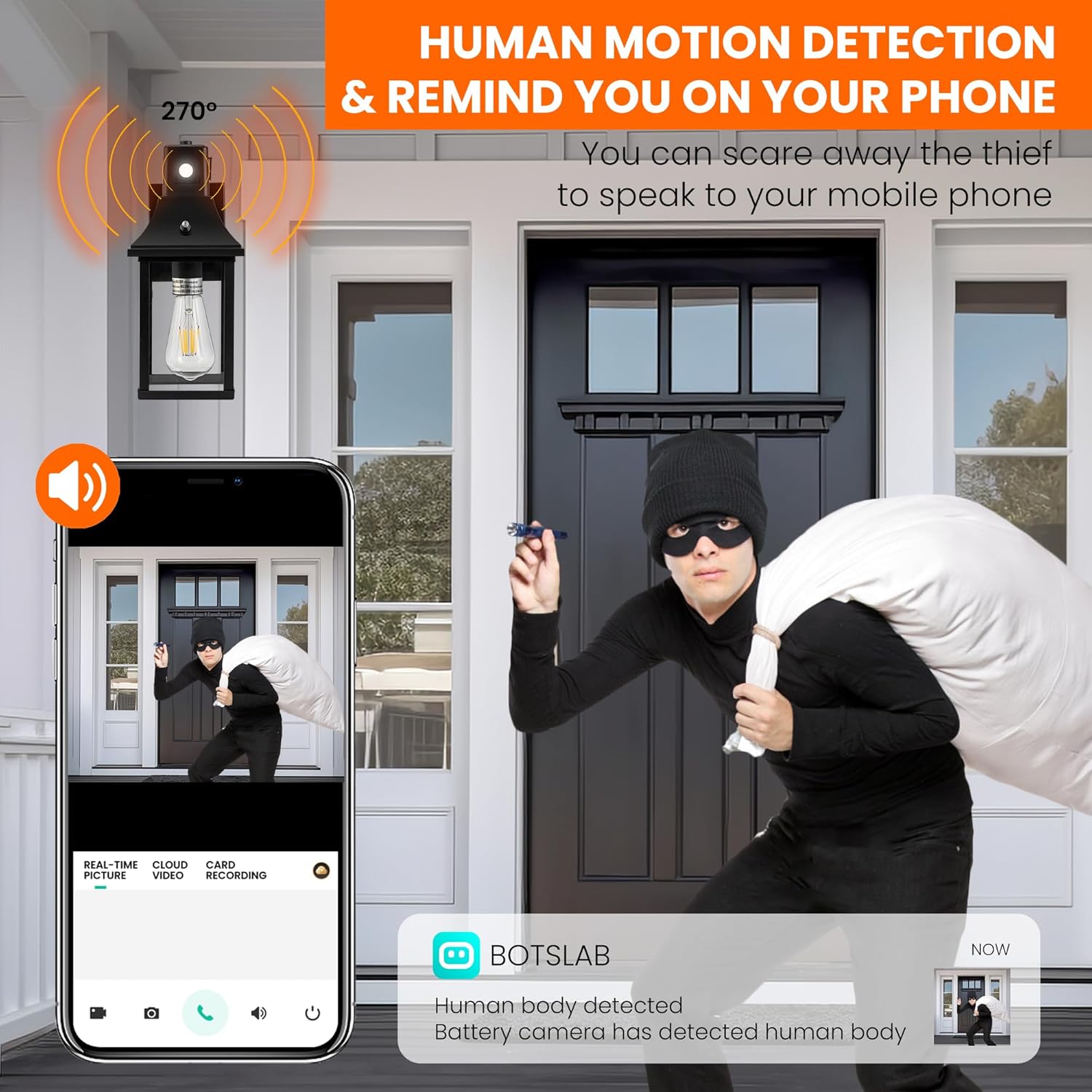 BUILT-IN SECURITY CAMERA:The outdoor porch lights built in cameara, saving space and electricity. It embedded in the porch light and is resistant to wind and rain. The camera can be manually rotated 270° and designed with a wide-angle 270° view, ideal for monitoring any corner. You can emit a sound from your phone to scare away thieves. The camera will detect moving people, pets, etc., immediately push to your mobile phone and form video playback, ready to guard your safety at any time