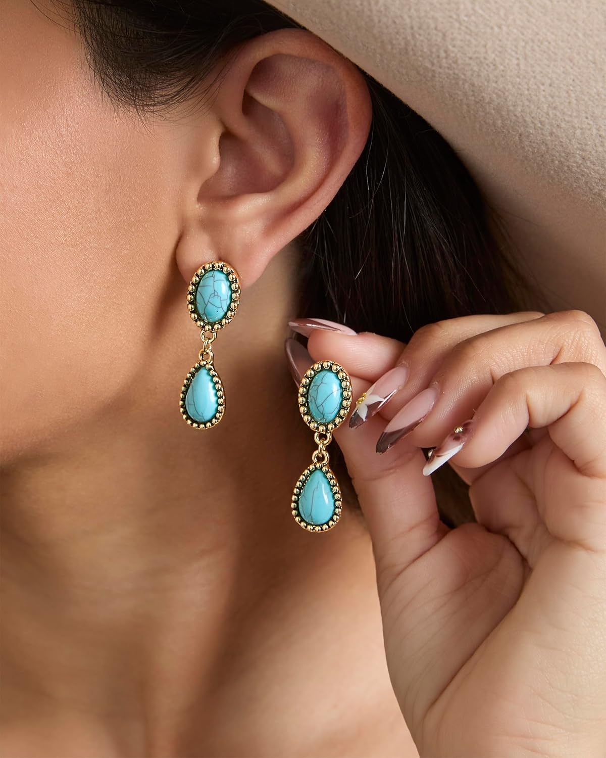 These turquoise earrings for women are available in either oxidized gold-tone or silver-tone metal, adding a touch of vintage charm to any ensemble.