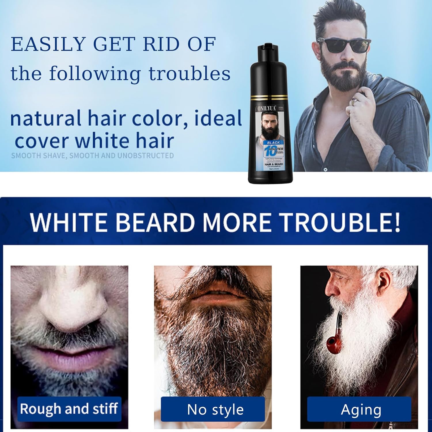 MULTIPLE USE for GRAY DYE : No need to worry your gray facial hair makes you look like a geezer. Onilyua mens beard dye makes you exude strength and masculinity in any situation. Works on all levels of facial grays and various beard types and textures, removing gray hair with every wash, not easy to fade.