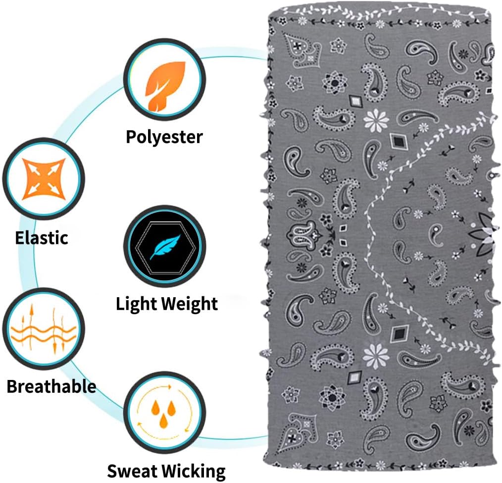 MULTIFUNCTION: They can use as a Neck Gaiter, Face Bandana, Headband, Head wrap, Face Scarf, Balaclava, Face Mask Cover, Beanie, Bandeau, Sweatband, Headwear, ect