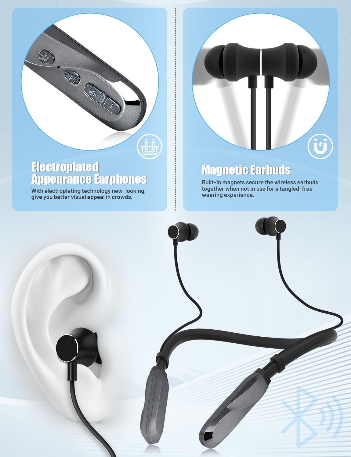 NOVEL APPEARANCE :Craving to stand out? This neckband bluetooth earbud is your solution. Its electroplating elevates it above the ordinary, shattering the dullness of traditional models. The unique finish gives it a sleek sheen, brimming with sophistication. Wear it, and you’ll not only enjoy music but flaunt your distinctiveness, instantly becoming the center of attention.