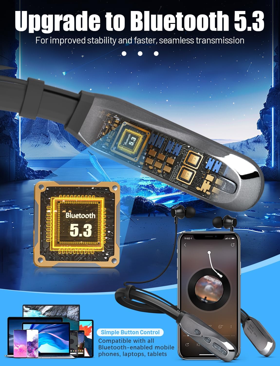 LATEST BLUETOOTH V5.3 & ADVANCED COMPATIBILITY: Around the neck headphones bluetooth 5.3 provides fast and stable transmission without interruptions. Wireless headphones supports most bluetooth devices .It also supports Voice Assistant, just short press the power button 2 times to start “Siri” or Google Voice Assistant.