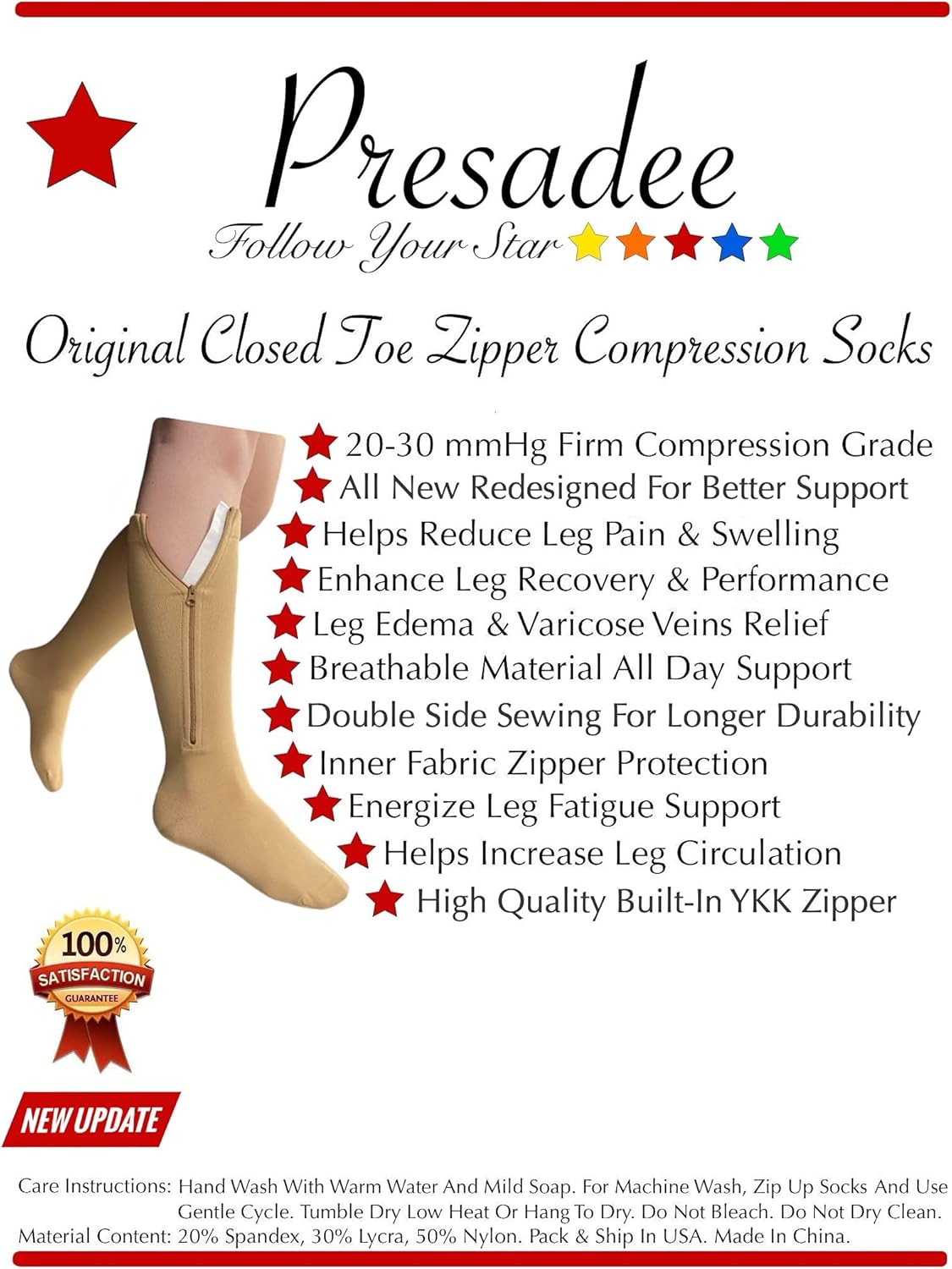 Our Original Zipper Compression Socks, Easy To Put On Or Take Off. The Closed Toe Provides Full Compression Support For All Day Relief. The 20-30 mmHg Firm Compression Grade Helps With Leg Swelling, Fatigue, Varicose Veins, Edema And Leg Circulations.