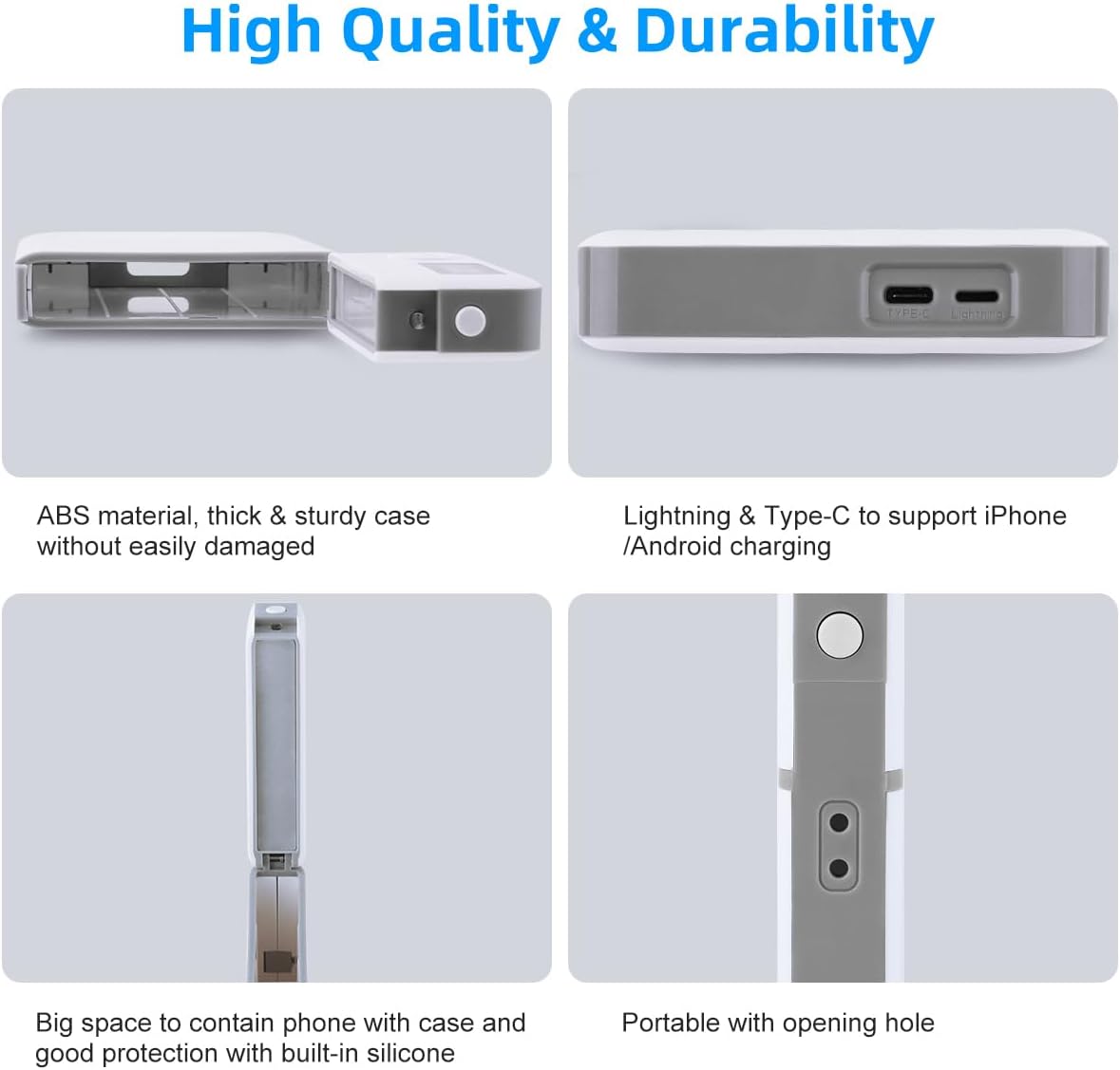 [Extra long Duration& Silent Mode] The cell phone lock box is powered by a 600mAh battery with a charging time of only 1 hour. Once fully charged, it can be used continuously for 60 to 90 days. The Lightning and Type-C can support iPhone/Android and other charging cables. Press the lock button 5 times consecutively to switch to Silent mode, so that it will never disturb others in public places such as library.