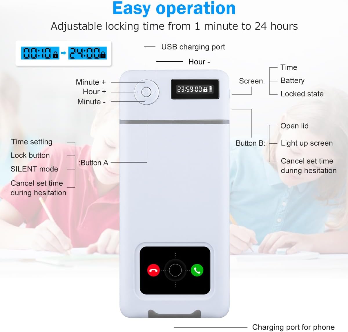[New phone lock box] Support iPhone/Android charging cables and USB cable is not included. Nowadays, the “dependency syndrome” such as excessive use of smartphones is becoming popular as a modern disease. To solve this problem, we have developed a device called the phone lock box with timer Lockable Time Container on which the lock is installed on the lid with the time ranged from 1 minute to 24 hours. Once the timer is activated, the container will be locked and cannot be opened until the specified time. It is a good product to cut off various temptations and help to cultivate a good lifestyle.