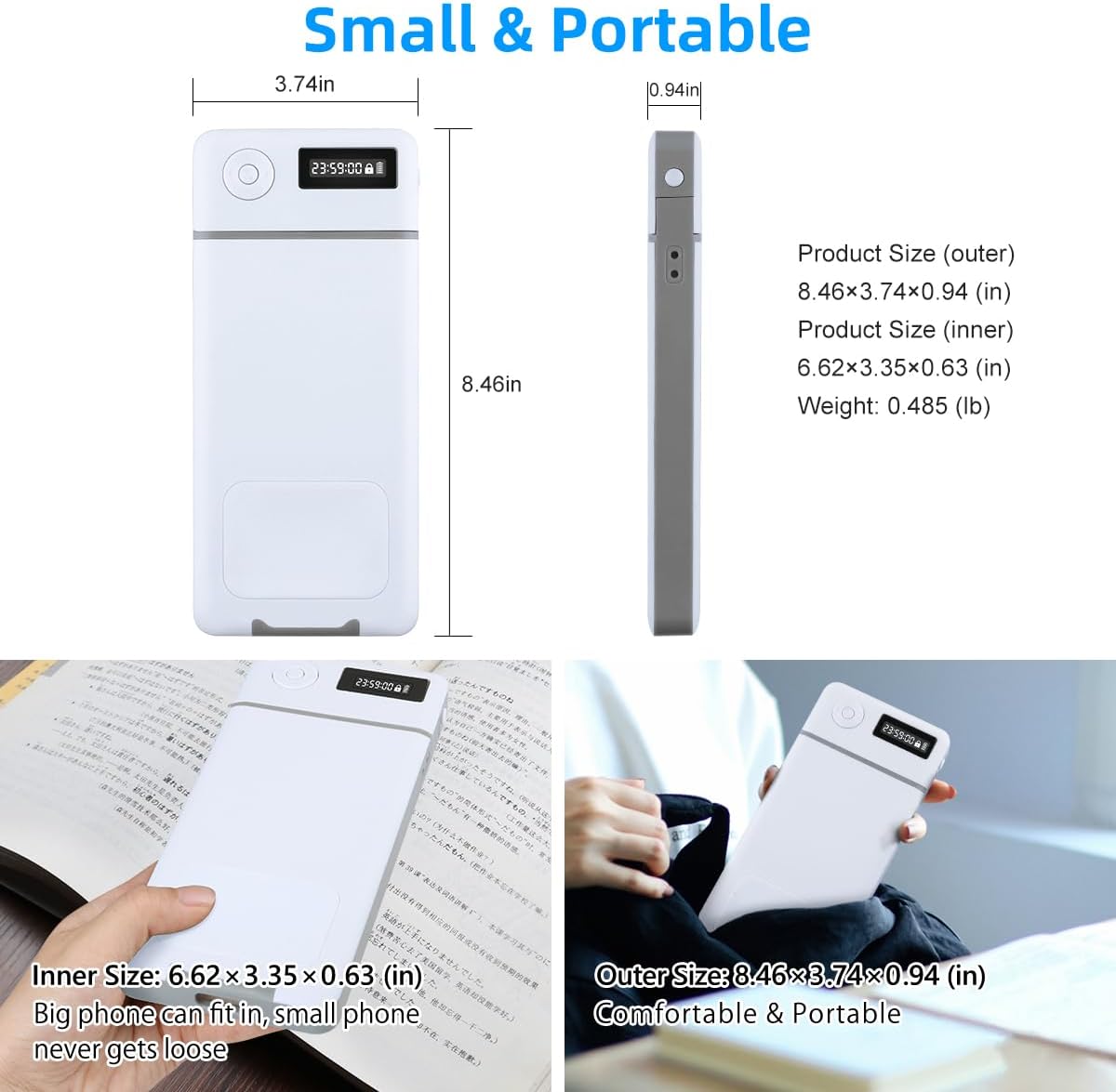 The phone lockbox size is only 8.46X3.74X0.94in, smaller than A5 paper. The weight is only 0.485lb, so it can be collected in the bag easily. It is easy to carry because of the small size.