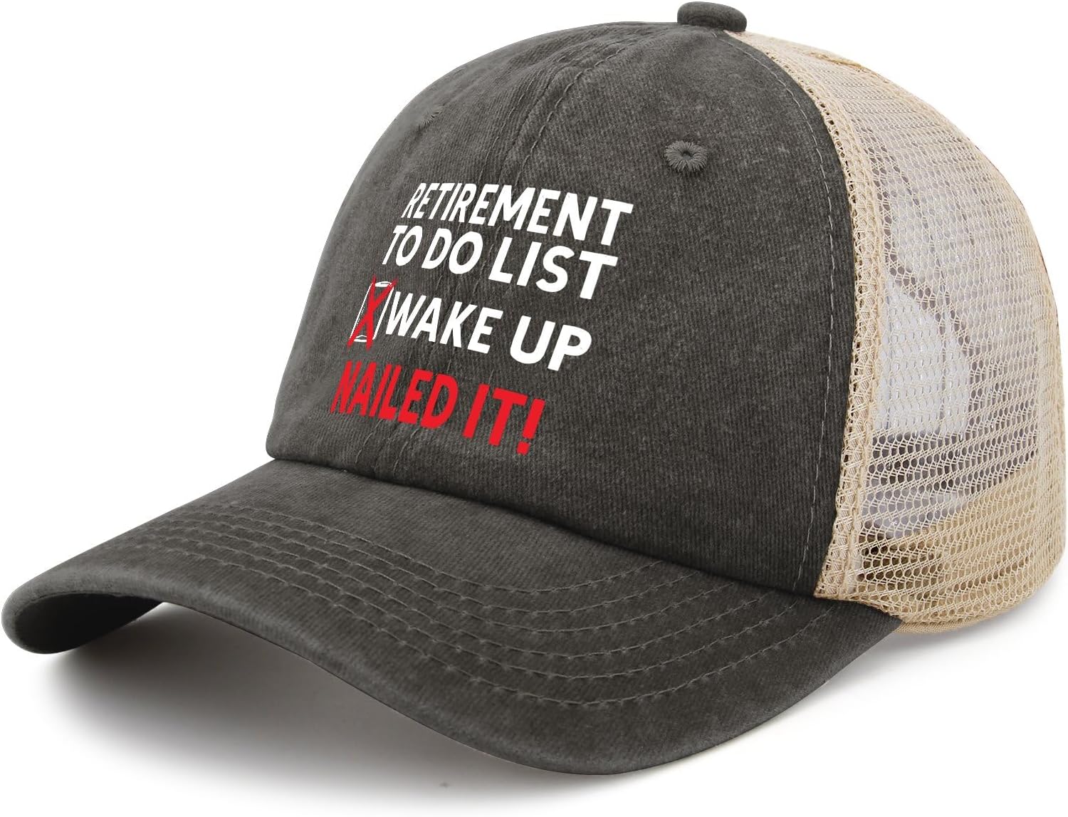 Retirement To Do List Wake Up Nailed It Hat Trucker Hat Men Trendy Mesh Baseball Cap for Men and Women Breathable Hat for Summer, Funny Trucker Hat Washed Hats Unisex Snapback Adjustable Hat