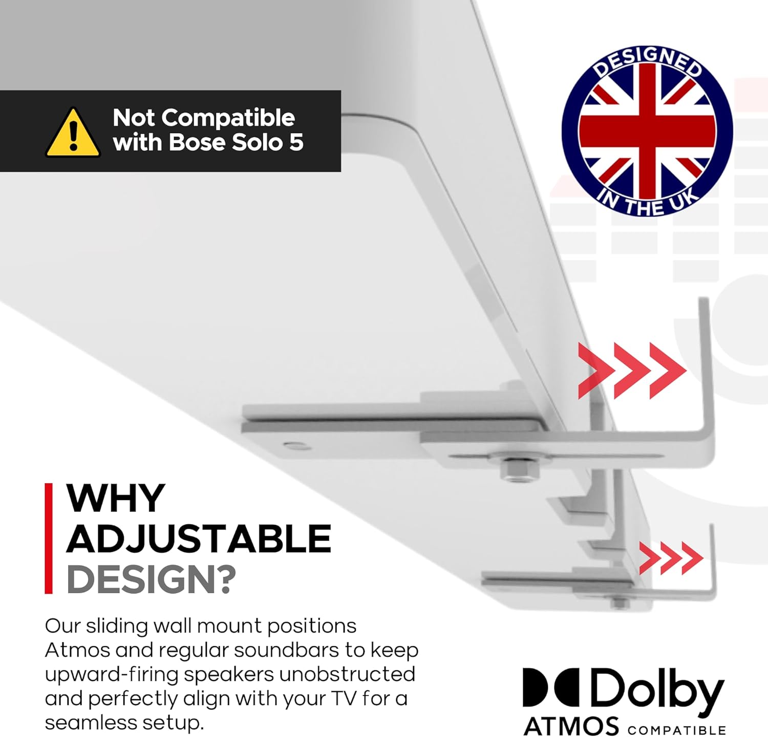 PRECISION ENGINEERED – To ensure the easiest installation and the best possible acoustic performance from the BOSE soundbar, the mount is crafted in durable 2.5mm steel, with a tough colour matched powder coat finish in either black or white to complement your speaker perfectly.