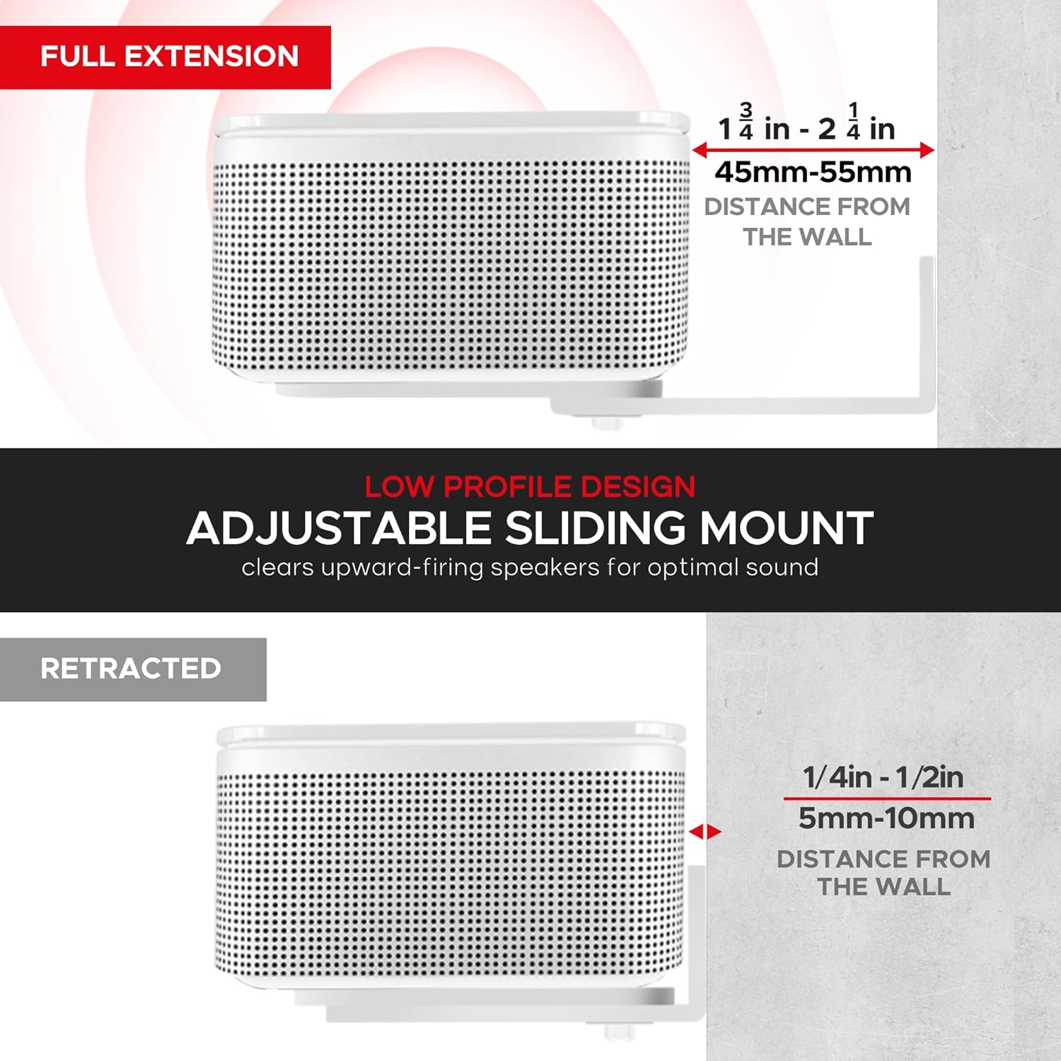 INGENIOUS DESIGN – This unique patented adjustable design is simple, yet cleverly thought out. It gives you the ability to adjust the space between the wall and the speakers from 10mm to 50mm, allowing you that extra space you need behind the speaker. Got bigger wires? Already got the trunking on the wall? Have an uneven wall? Want to position the speaker further forward? Not a problem! We’ve got you covered with this versatile wall mount!