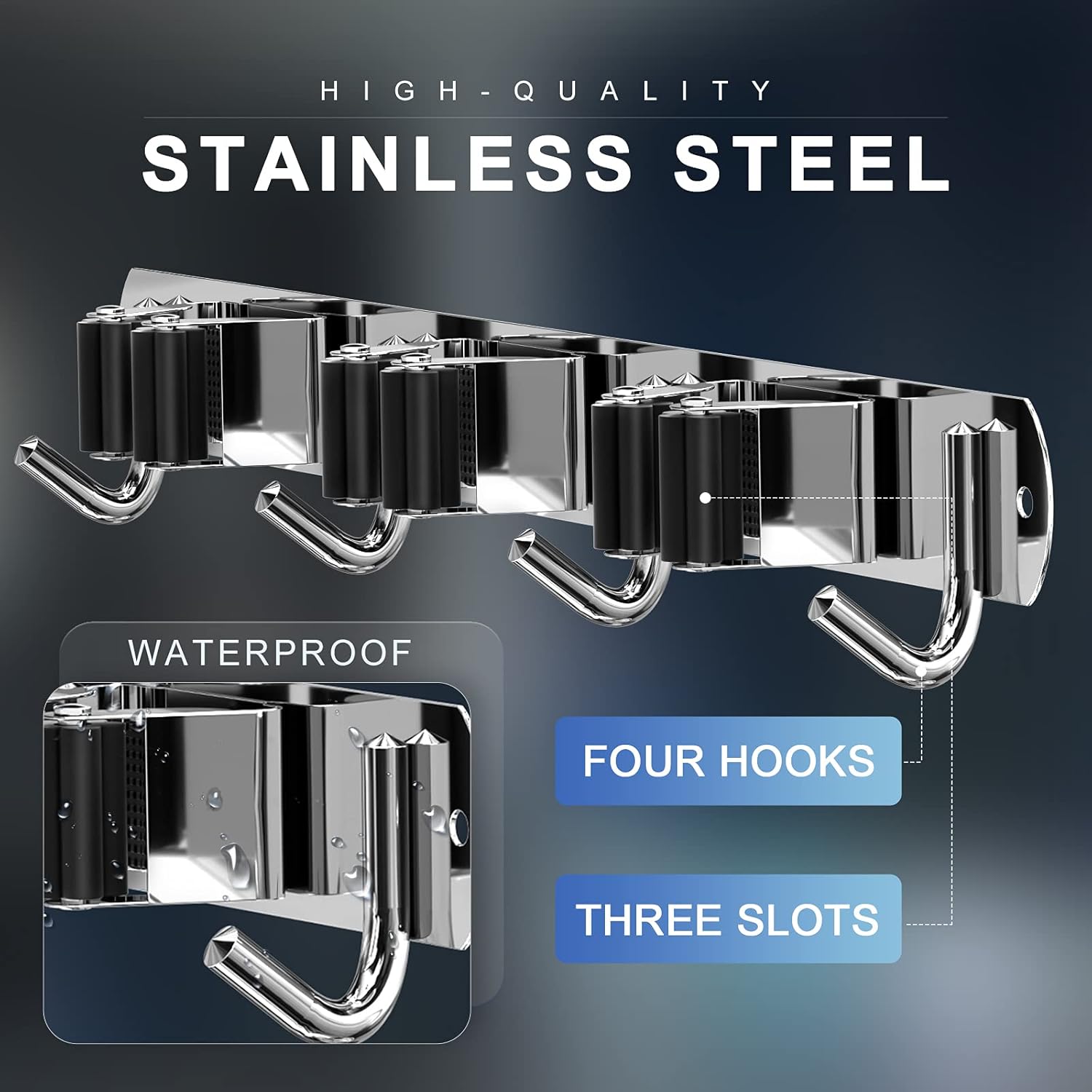 🏡【STURDY BROOM HOLDER】Each broom holder wall mount has 3 racks 4 hooks. Made of sturdy 304 stainless steel, the broom holder is corrosion-resistant, rustproof and waterproof. Compared with the plastic broom rack, it is more stronger and has a longer service life.