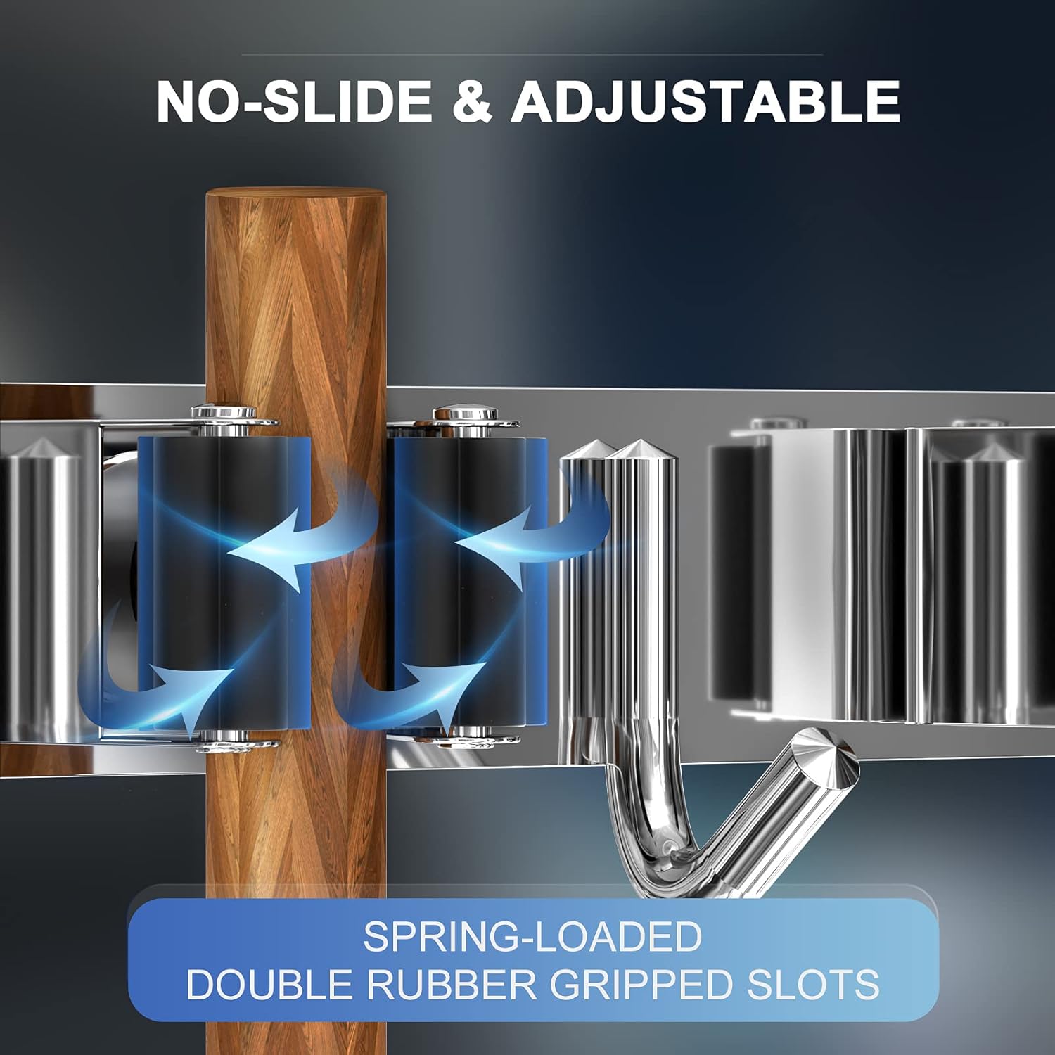 🏡【NON-SLIDE DESIGN】Each rack of the broom and mop holder wall mounted features an adjustable triangular design. The spring-loaded, double rubber gripped slots can keep a stronger hold on your items with diameter of 0.7 inch-1.3 inch. Whether wet mops or baseball bats, nothing slips.